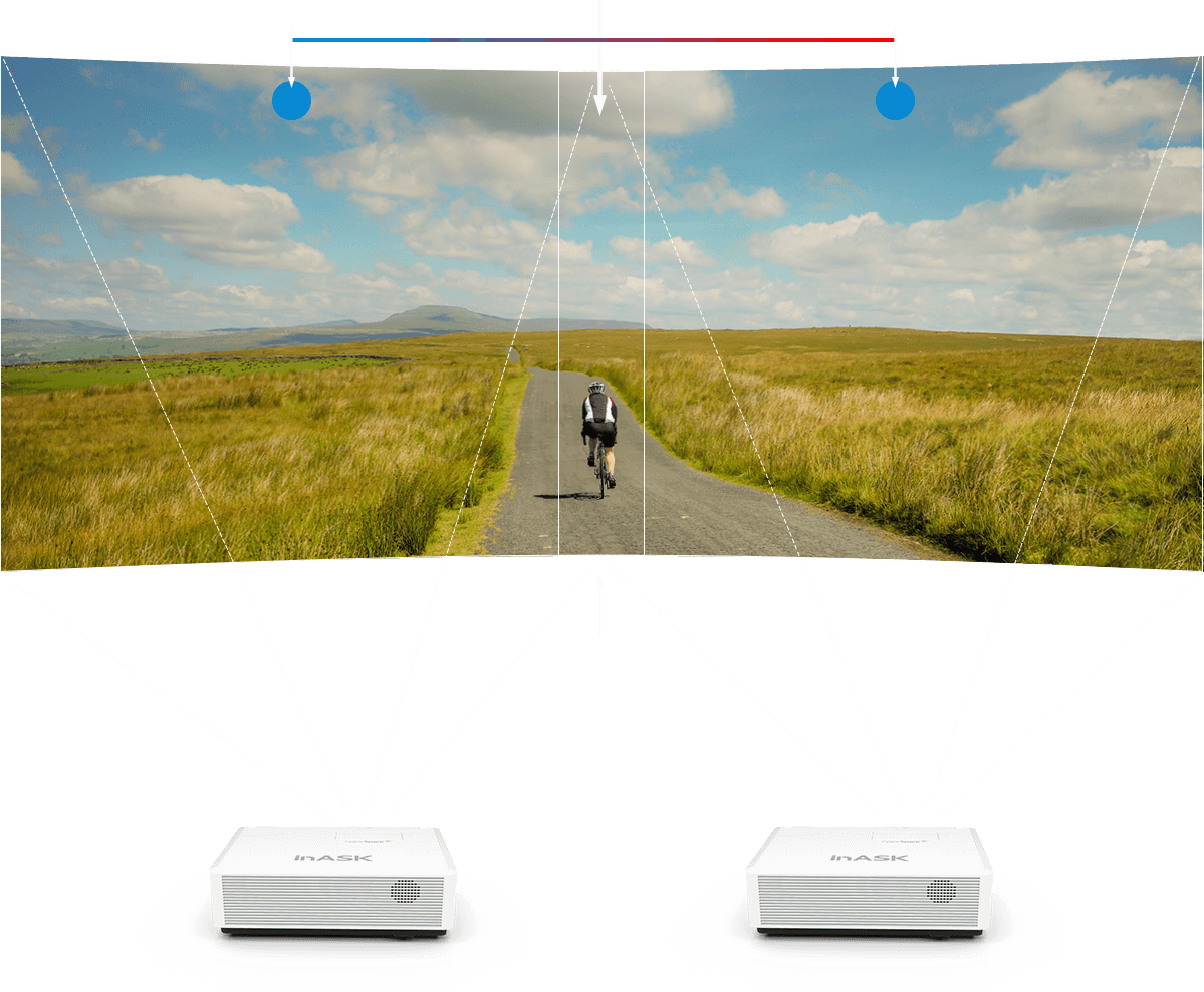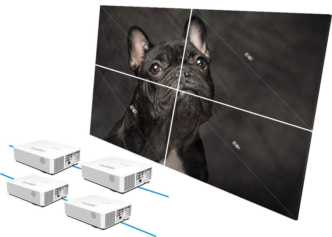 大畫面拼接一般需高端投影機結合分屏器實現,成本高昂施工繁瑣;而inASK投影機無需串接分屏器僅用多臺投影機即可自主完成大畫面拼接,最大支持5*5=25(塊)拼接,成本投入降到最低